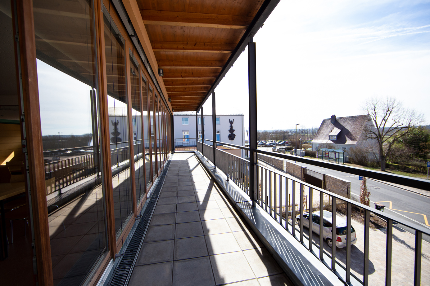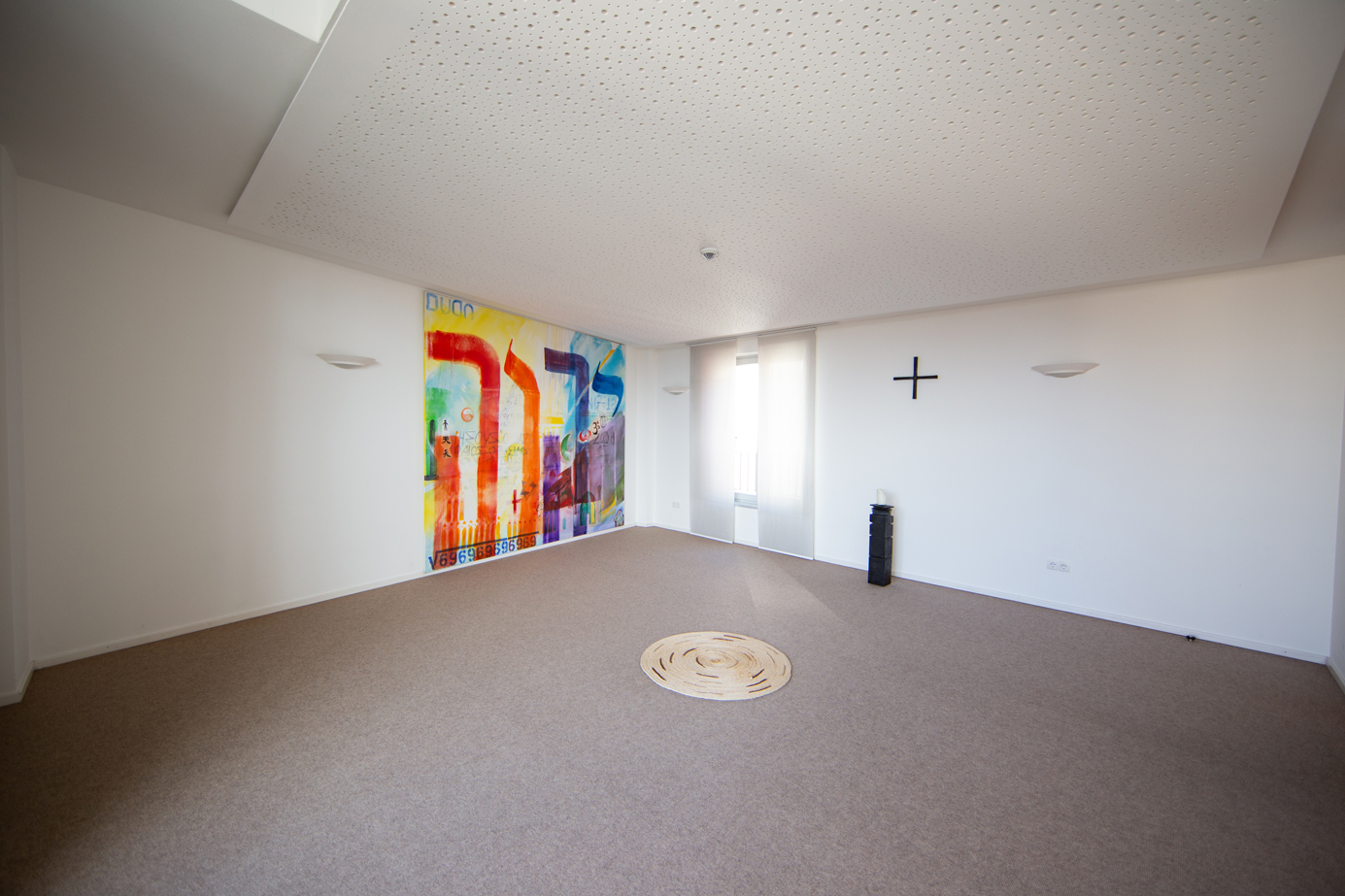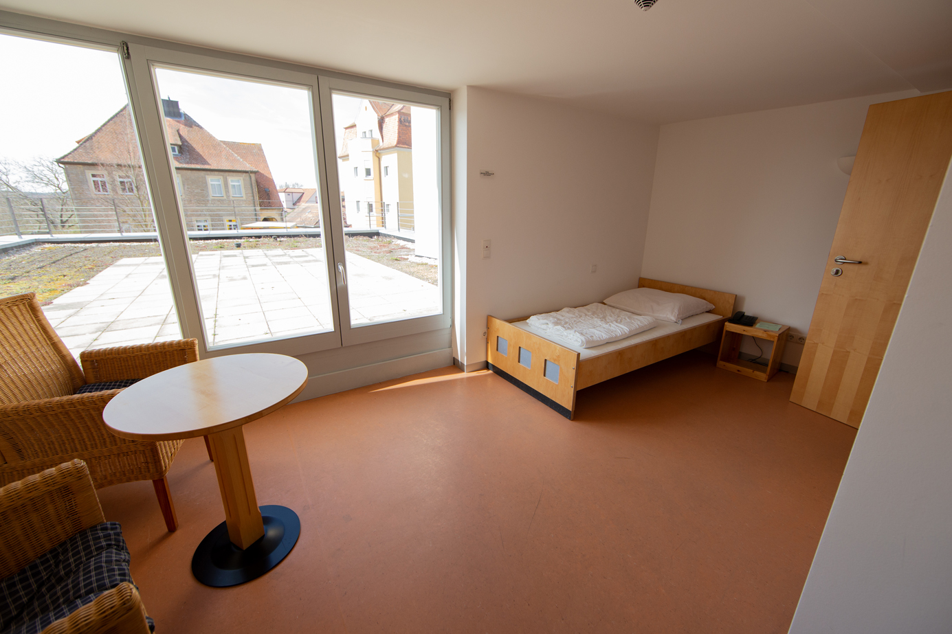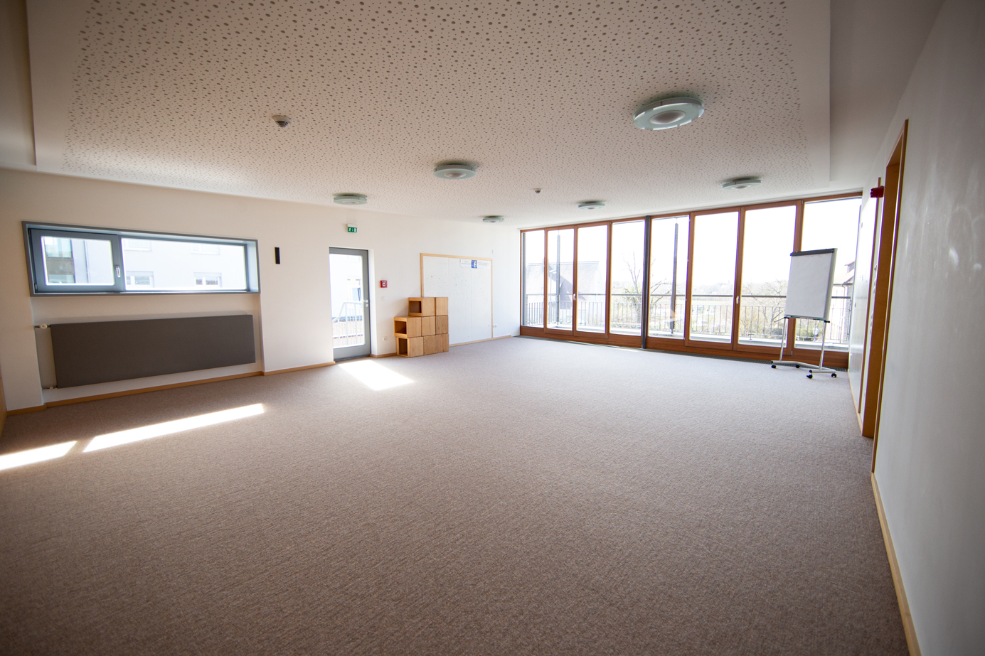 Im Haus gibt es außerdem einen Meditationsraum und einen großen Gruppenraum sowie einen Speisesaal. Die großen vollflächigen Fenster sorgen hier für eine helle und freundliche Atmosphäre.