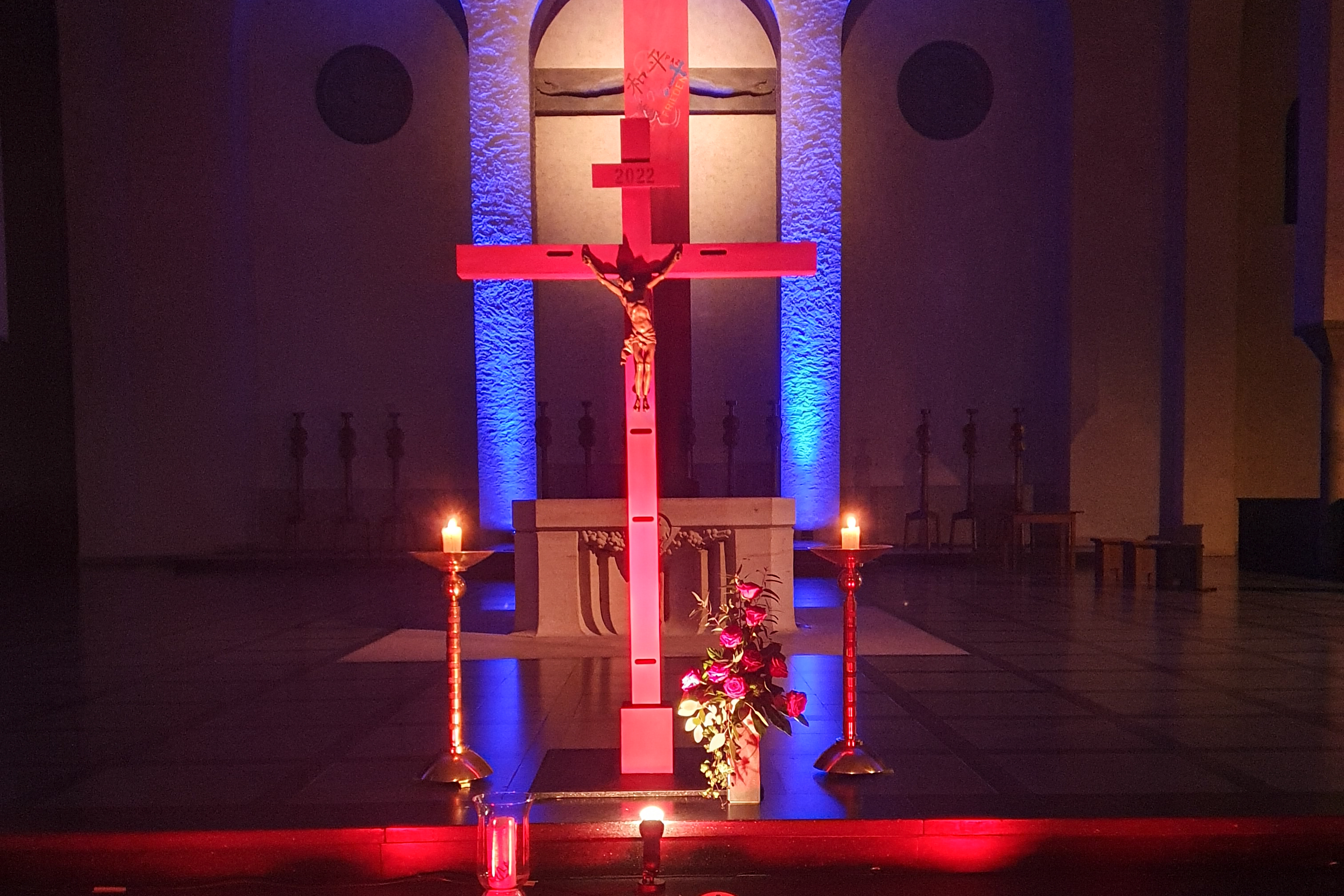 Für viele ein Highlight ist die Liturgie am Karfreitagabend, das „Mysterienspiel“: Die Gruppen stellen nacheinander verschiedene Beträge am letzten Weg Jesu entlang vor, in denen sie Geschichten aus der Bibel ins Heute holen.